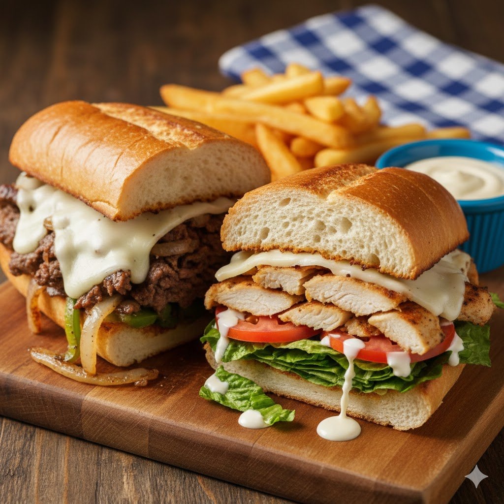 Tender strips of seasoned steak or chicken grilled with peppers and onions, topped with melted cheese, fresh lettuce, and creamy mayo. Available as a sandwich or a combo meal.